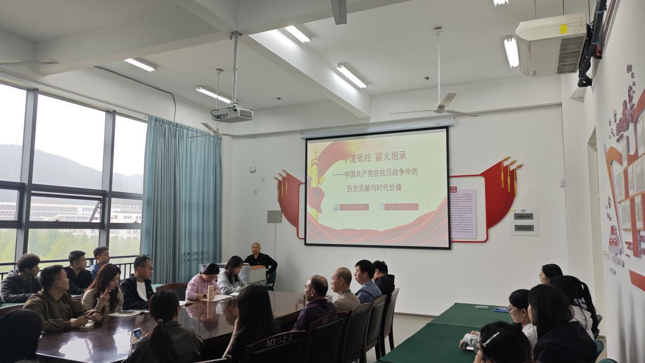 为纪念中国人民抗日战争暨世界反法西斯战争胜利80周年,深刻感悟中国共产党在抗战中的中流砥柱作用,2025年11月4日,信息中心林宗洪主任讲授“中流砥柱 薪火相承——中国共产党在抗日战争中的历史贡献与时代价值”专题党课。信息工程系学生党支部全体党员和入党积极分子、图文信息中心党支部全体党员参加党课。